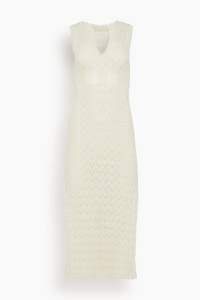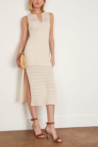 The Vanessa Bruno Elka Dress features the bohemian flare you love from this designer. You'll love the pointelle knit design of this midi dress with a slim silhouette. Wear yours with sandals and a tote bag. FIT DESCRIPTION MODEL MEASUREMENTS - Fits true to size, take your normal size - Knit dress - Midi length - Slim silhouette - V-neckline - Semi-sheer - Side slits - Cotton - Stylist note: This dress comes with a slip - Harriet is wearing a size 0/ XS - Bust: 32" - Waist: 24" - Hips: 30.5" - Height: 5’8.5”