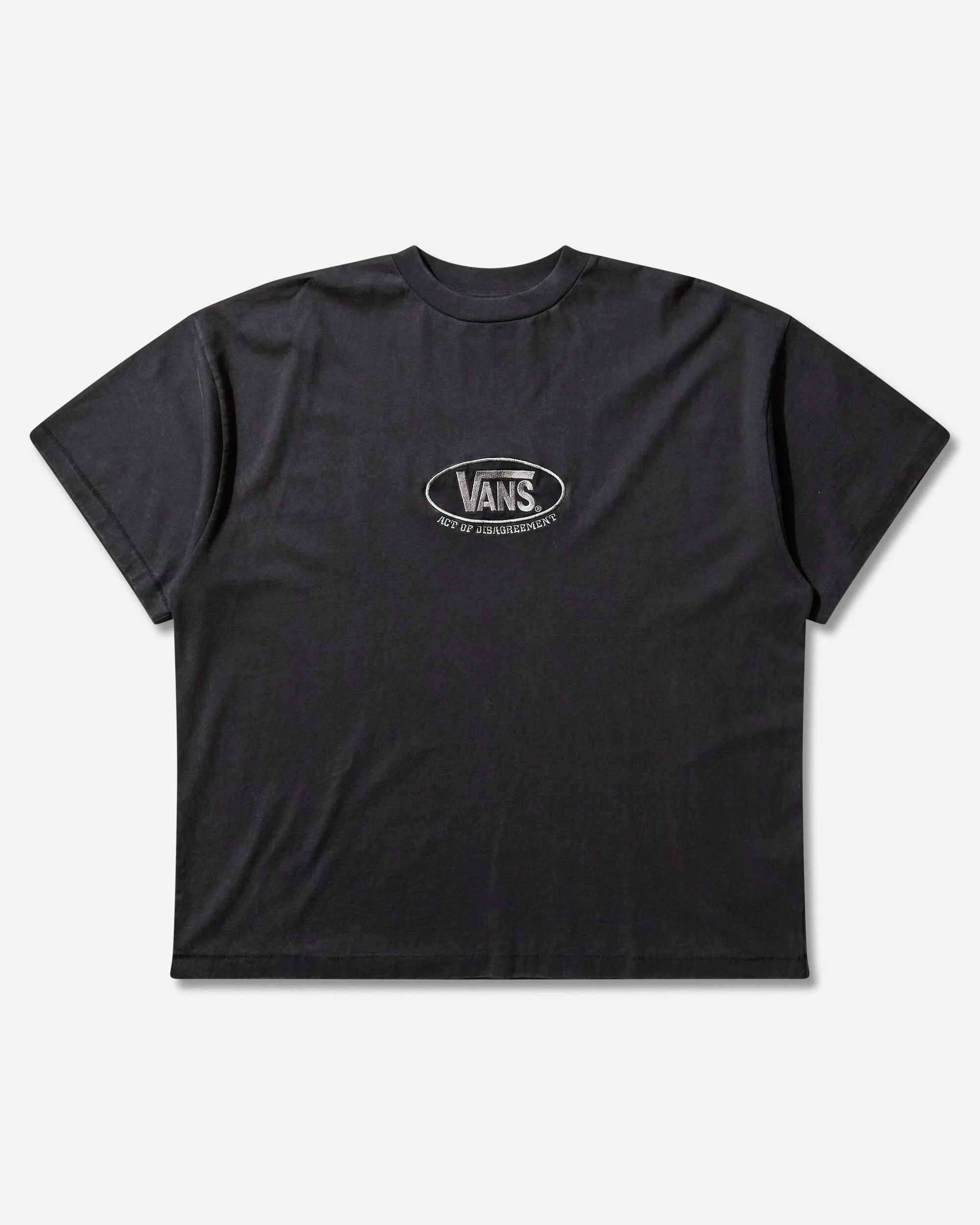Vans Act of Disagreement Oval Logo T-Shirt Washed Black Vans and Slam Jam present Act of Disagreement, a new apparel range representing the Style and Mentality of the Bedroom Generation. Heavyweight 230 gsm 100% cotton short sleeve tee. Oversized fit and vintage wash. Embroidered Vans logo with twill inserts on the chest. Slam Jam branded trim placed inside on the care label. - 100% Cotton - Oversized Fit - Vintage Wash - Ribbed Collar - Embroidered Logo at Chest - Style Code: VN000TR3EMQ1