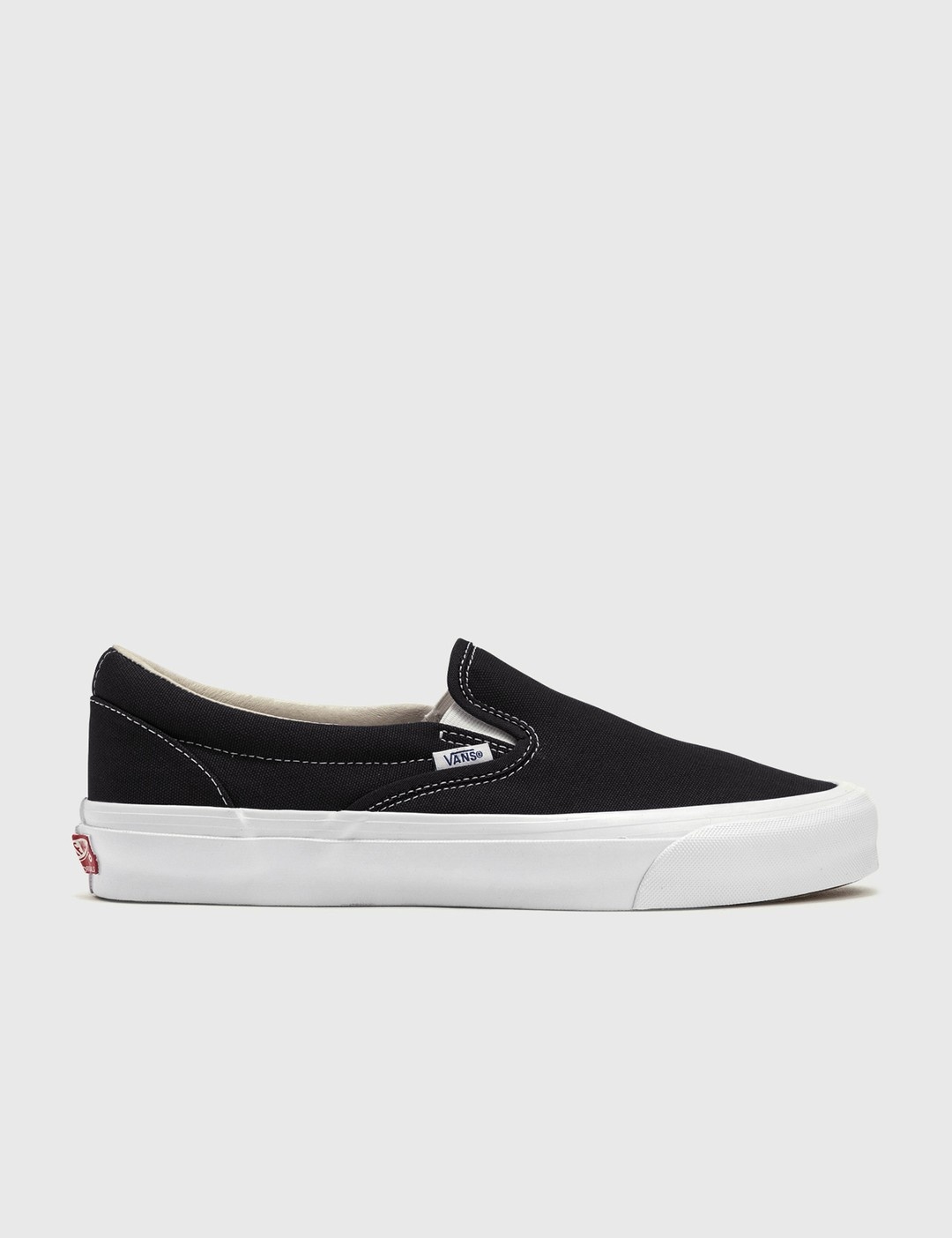 - Vans - OG Classic Slip-on LX - Low top sneaker - Slip-on silhouette - Round toe - Canvas upper - Padded collar - Logo appliqué at heel - Signature waffle rubber sole - Contrast stitching - Color: Black/White - Material: 100% Canvas; 100% Rubber - See more Sneakers and Shoes