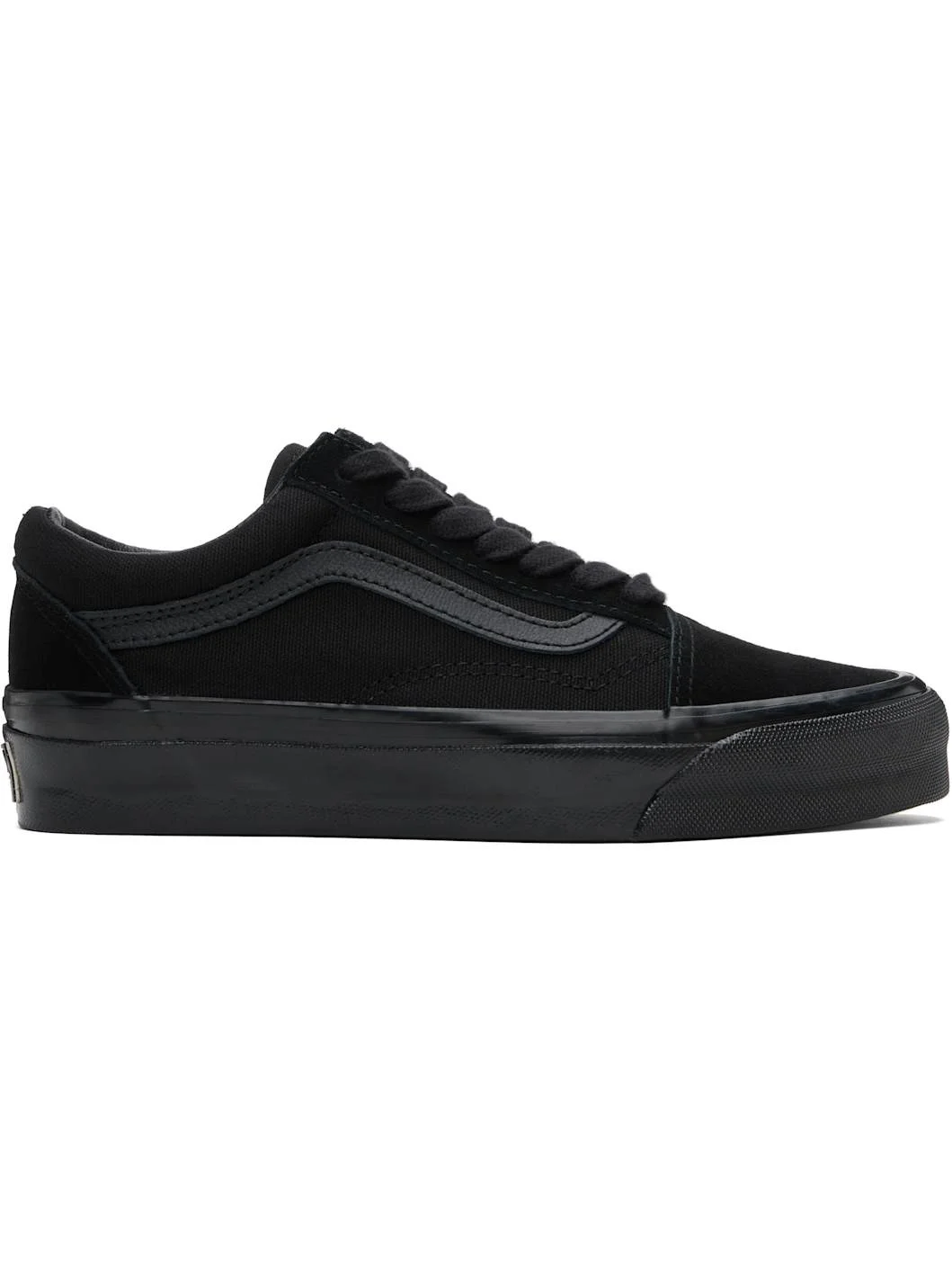Low-top 8 oz canvas and suede sneakers in black. · Lace-up closure · Padded tongue and collar · Grained leather Sidestripe™ at sides · Padded Sola ADC foam footbed · Buffed leather and canvas lining · Rubberized logo patch at heel · Treaded rubber sole Supplier color: Black Upper: textile, leather. Sole: rubber. Made in Philippines 242739F128032