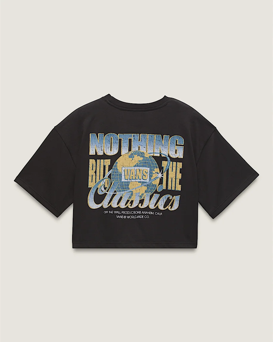 Style VN000MC7BLK Celebrate the best of Vans® in the Branded Classics T-Shirt, a heavy cotton jersey crew neck T-shirt in a relaxed crop silhouette. It features a vibrant no base screenprint of a bold Vans logo on the front and a globe on the back. Details - Short-sleeve mesh crew neck t-shirt - No base vibrant screen printed graphic on the front and back - Relaxed fit for easy movement and a laid-back feel - 100% cotton