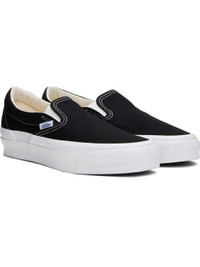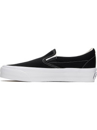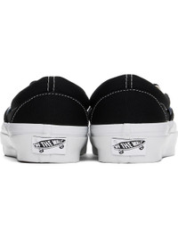 Low-top slip-on canvas sneakers in black. · Elasticized gussets at tongue · Padded collar · Logo flag at outer side · Padded Sola ADC foam footbed · Grained leather and canvas lining · Rubberized logo patch at heel · Treaded rubber sole · Contrast stitching in white Supplier color: Black/White Upper: textile. Sole: rubber. Made in Philippines 251739F128016