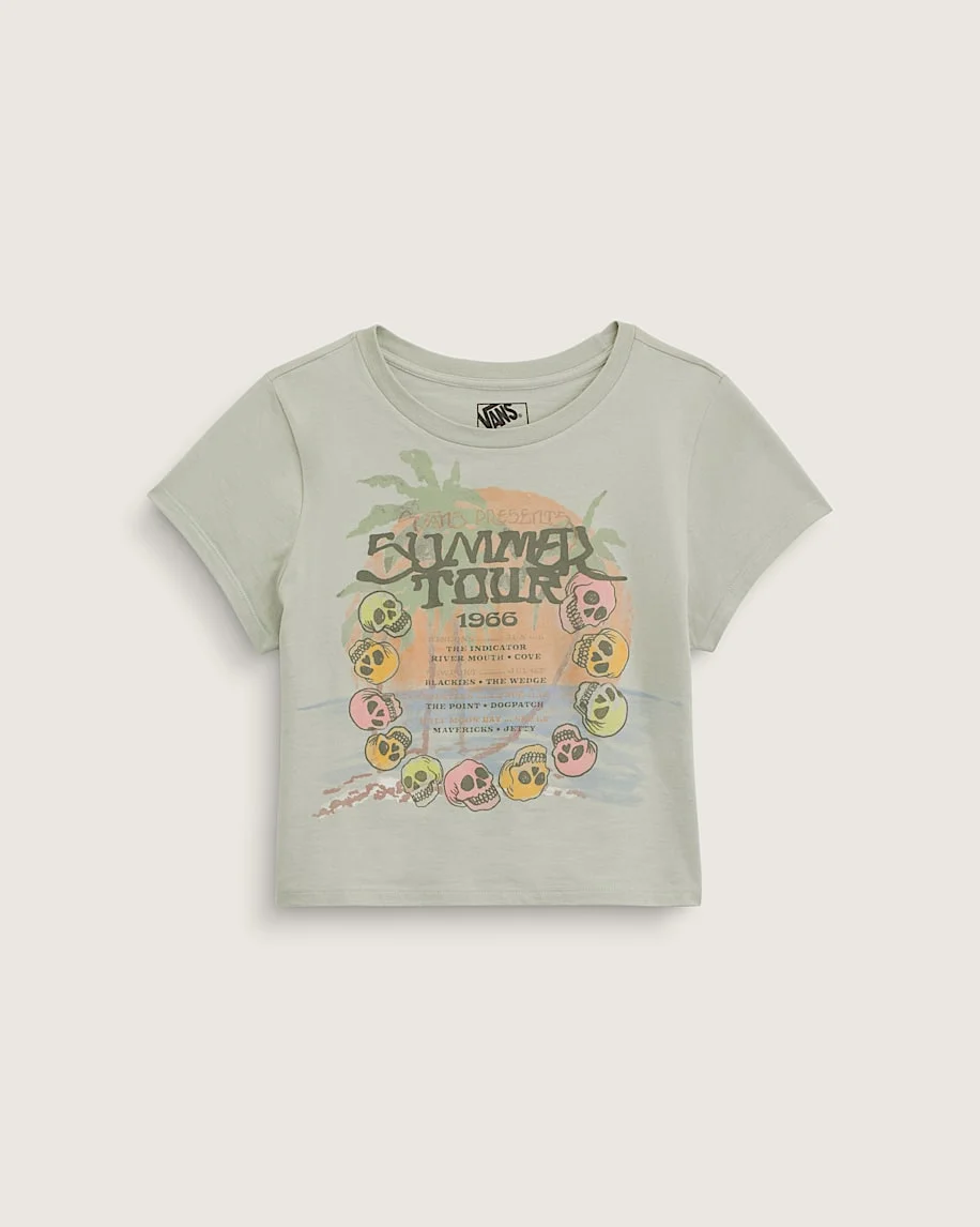 Style VN000XR2FSG Channel Vans' surf and skate roots in this cropped tee. The relaxed fit and soft cotton fabric keep you comfortable, while the retro-inspired ''Summer Tour 1966'' graphic with colorful skulls adds a touch of California cool. Perfect for pairing with high-waisted bottoms, this shirt lets you embrace Vans' free-spirited heritage in easygoing style. Details - Cropped length for a modern, shortened silhouette - Short sleeves for a casual, everyday style - Crewneck shirt for a classic look - Screen print artwork for a long-lasting design - 100% cotton