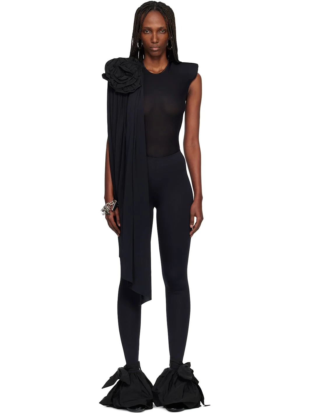 Stretch nylon jersey bodysuit. Draped panel with floral applique at shoulder. · Crewneck · Adjustable press-stud closure at bottom · Padded shoulders Supplier color: Black Body: 73% polyamide, 27% elastane. Trim: 100% polyester. Made in United States 252999F103001