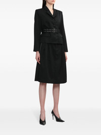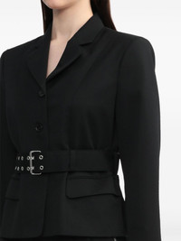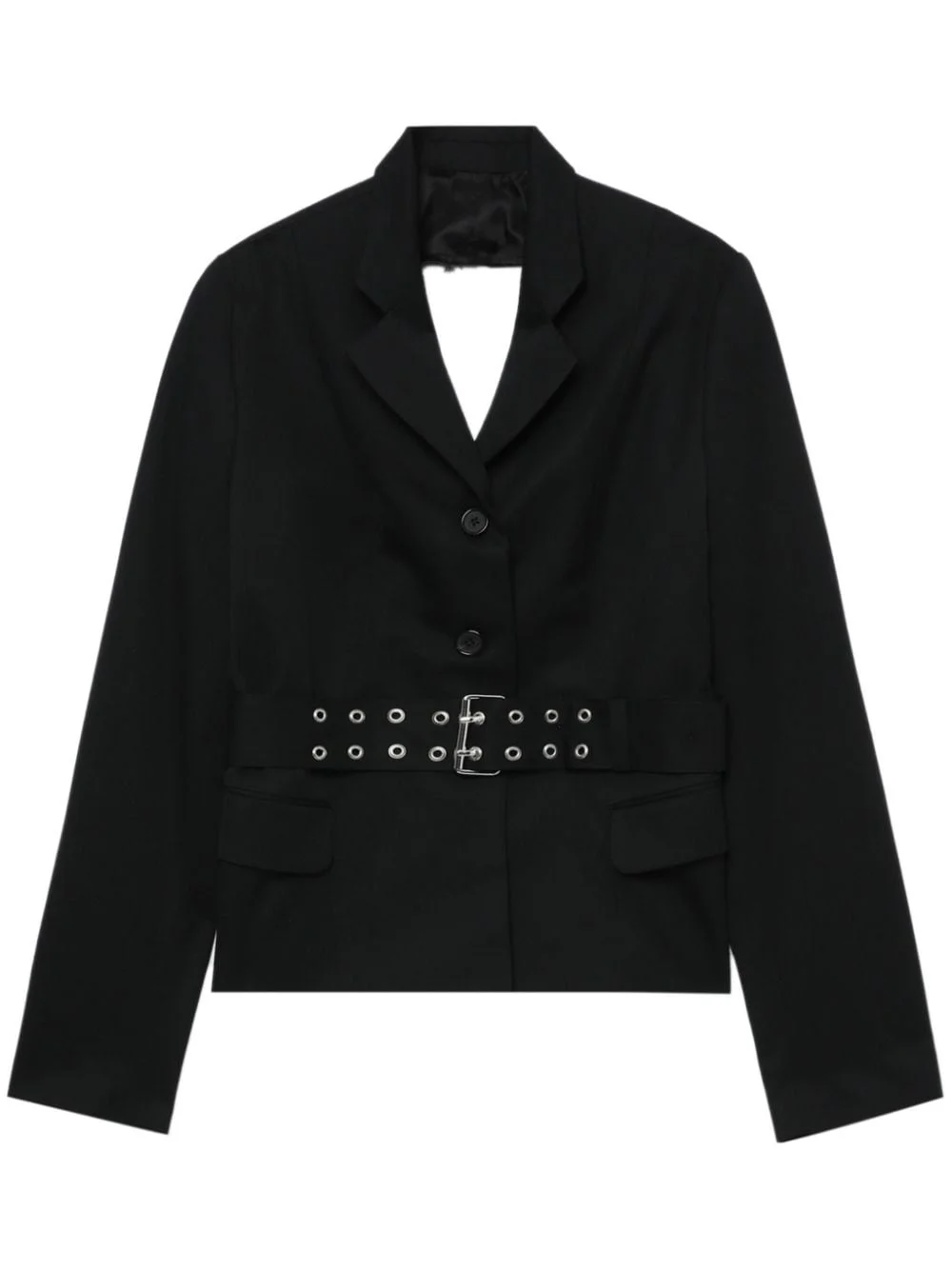 open-back belted blazer Highlights - Jet black - Detachable and adjustable waist belt - Metal eyelet detailing - Notched lapels - Front button fastening - Long sleeves - Buttoned cuffs - Open back - Two front flap pockets - Straight hem Imported Composition Polyester 55%, Wool 45%