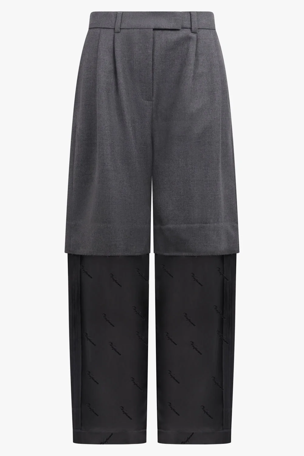 A deconstructed take on tailored classics, these Vaquera trousers fuse precision suiting with the brand’s signature irreverence. Cut from pure wool and lined in fluid viscose, this mid-rise silhouette features a refined wide leg balanced by front pleats that create soft structure through the waist. The unexpected chopped hem reveals the lining beneath—printed with a subtle, repeated Vaquera logo—introducing an artful contrast between polished tailoring and raw, exposed construction. Functional pockets and traditional closures anchor the design in wearability while maintaining its directional edge. - Fabrication: 100% Wool; Lining: 100% Viscose - Mid-rise, wide leg silhouette crafted for clean, elongated lines - Chopped hem with exposed logo-printed lining adds a deconstructed finish - Front pleats offer soft structure and refined shaping at the waist - Hook-and-eye and zipper fly closure for classic tailoring ease - Front pockets and back welt pockets provide functional utility Style them with a crisp shirt or oversized knit to highlight the interplay between sharp tailoring and subversive detailing. Size and Fit Tiah: Model is 178cm/5’9” and is wearing a size 26 Model Measurements: Bust: 86cm, Waist: 69cm, Hips 90.5cm Fits true to size