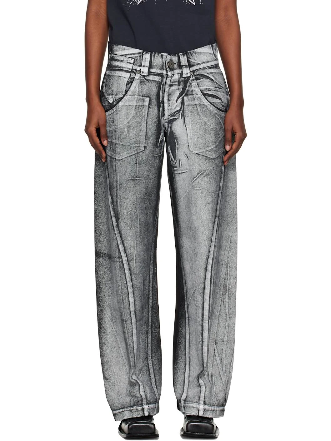 Cotton canvas trousers. · Fading throughout · Wide-leg · Mid-rise · Belt loops · Five-pocket styling · Button fly · Twisted outseams · Logo patch at back waistband Supplier color: Black 100% cotton. Made in Italy 252999F087000