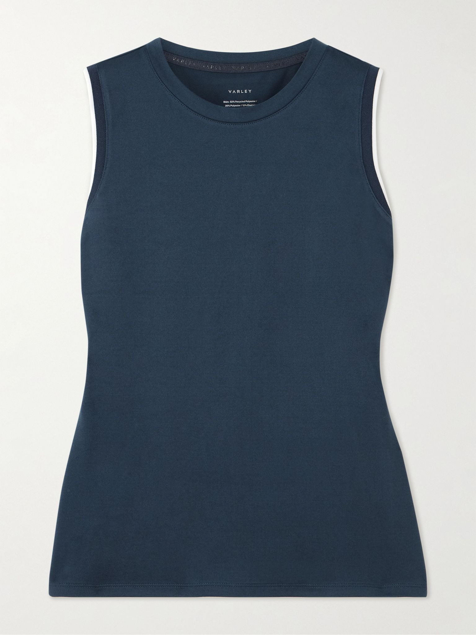 Stay cool on the tennis court with Varley's 'Arton' tank. It's made from breathable jersey that boasts four-way stretch and has a relaxed fit with a classic crew neckline and contrasting arm holes. Wear yours with a tonal skirt. Size & Fit - Fits true to size, take your normal size - Designed for a relaxed fit - Mid-weight, stretchy fabric - Model is 177cm/ 5'10" and is wearing a size Small Model measurements: - Bust: 77cm/ 30.5" - Waist: 62cm/ 24.5" - Hip: 88cm/ 34.5" Details & Care - Navy and white stretch-jersey - Slips on - 52% recycled polyester, 36% polyester, 12% elastane - Machine wash