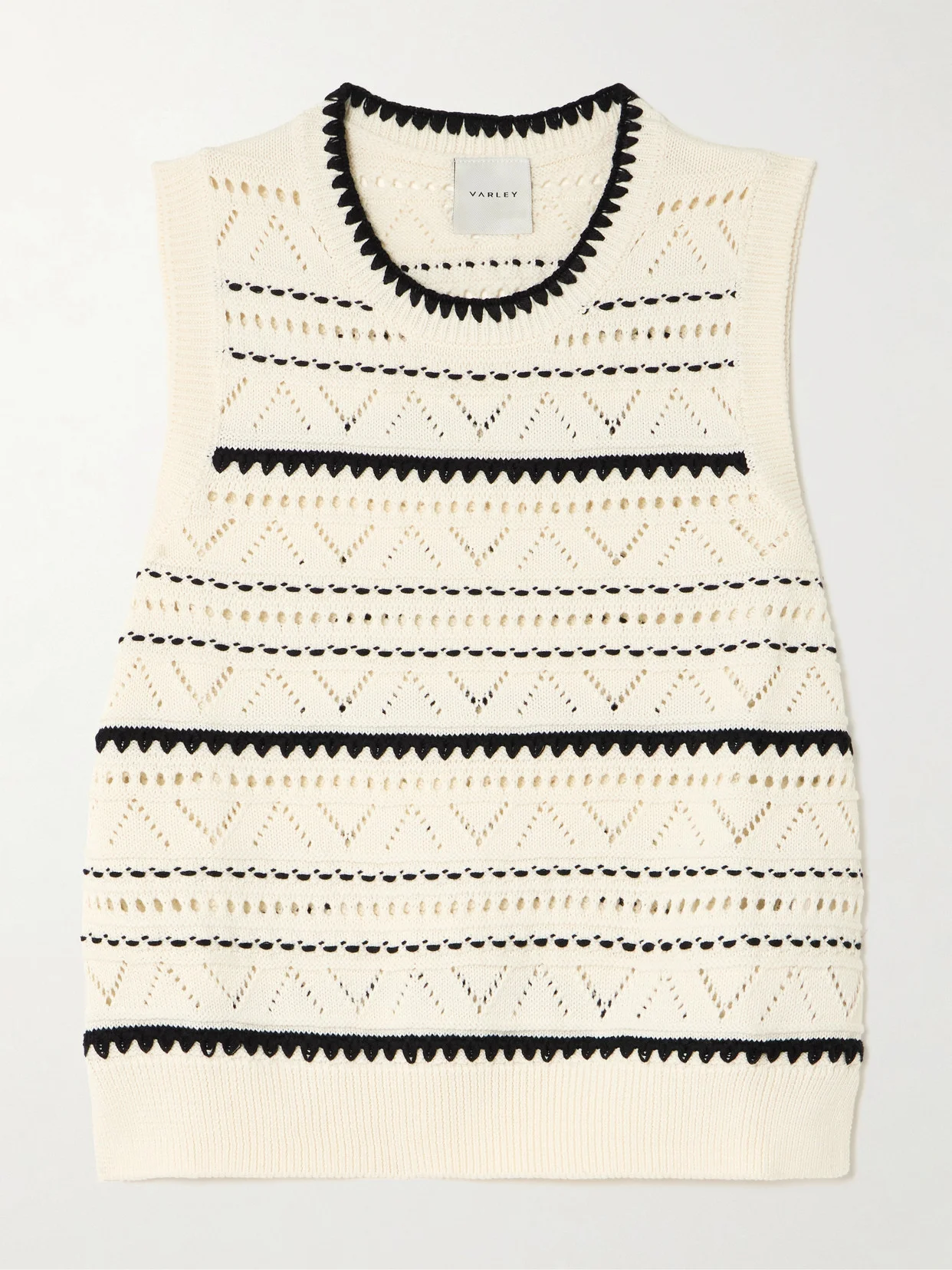 Varley's 'Athena' vest is made from cotton that's pointelle-knitted with geometric stripes and chevrons. It has a slightly loose shape with a classic crew neckline and slits at either side of the hem. Underpin yours with a bralette for coverage.