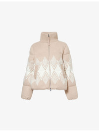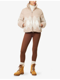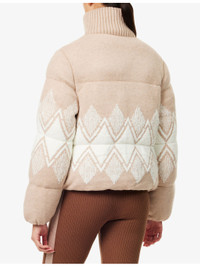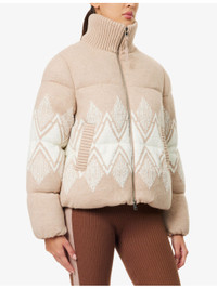 PRODUCT DETAILS - Varley knitted jacket - 55% acrylic, 20% polyester, 15% polyamide, 6% wool, 4% other fibres; filling 100% polyester; lining 60% cotton, 40% polyester; sleevelining 55% viscose, 45% polyester - Exposed zip fastening at front - Regular fit, ribbed high-neck, long sleeves, elasticated cuffs, welt pockets at front, brand tab at side, jacquard diamond pattern at front and back, all-over knitted, all-over quilted and padded, fully lined - Dry clean - True to size - Model is 5ft 10in/1.78m and wears a size small - Heavyweight, stretchy Ref: R04563052