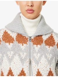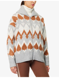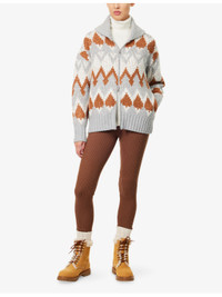 PRODUCT DETAILS - Varley knitted jacket - 38% acrylic, 32% cotton, 13% polyester, 9% polyamide, 6% wool, 2% elastane - Exposed zip fastening at front - Relaxed fit, shawl collar, long sleeves, two slip pockets at front, all-over boucle jacquard diamond pattern, ribbed trims - Dry clean - True to size - Model is 5ft 10in/1.78m and wears a size small - Midweight, stretchy Ref: R04563048