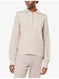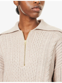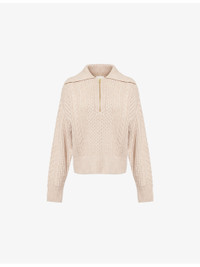 PRODUCT DETAILS - Varley knitted jumper - 33% viscose, 23% polyamide, 20% merino wool, 20% cotton, 4% cashmere - Zip fastening - Relaxed fit, wide collar, long sleeves, half-zip at front, cable-knit pattern, ribbed trims - Hand wash - True to size - Model is 5ft 10in/1.78m and wears a size small - Midweight, stretchy Ref: R04544279