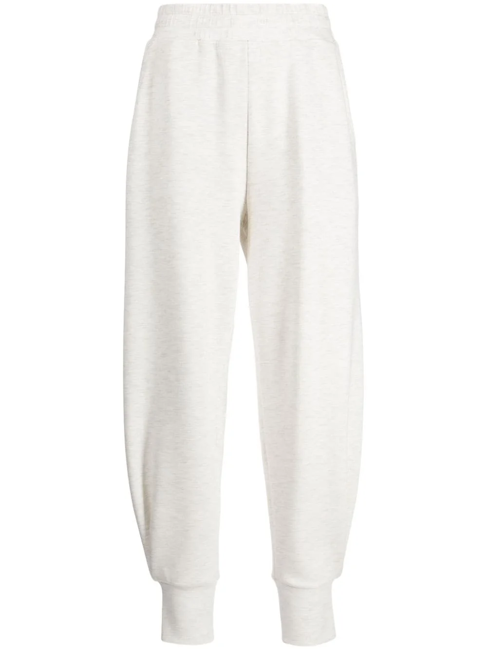 high-waisted relaxed track pants Highlights - Light grey - Melange effect - High waist - Elasticated waistband - Two rear welt pockets - Elasticated ankles Made in United Kingdom Composition Viscose 72%, Polyester 23%, Elastane 5% SIZE & FIT Measurement INSIDE LEG 27.95 in(71 cm) HIPS 39.37 in(100 cm) WAIST 24.4 in(62 cm) Washing instructions Machine Wash