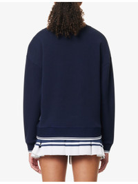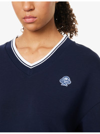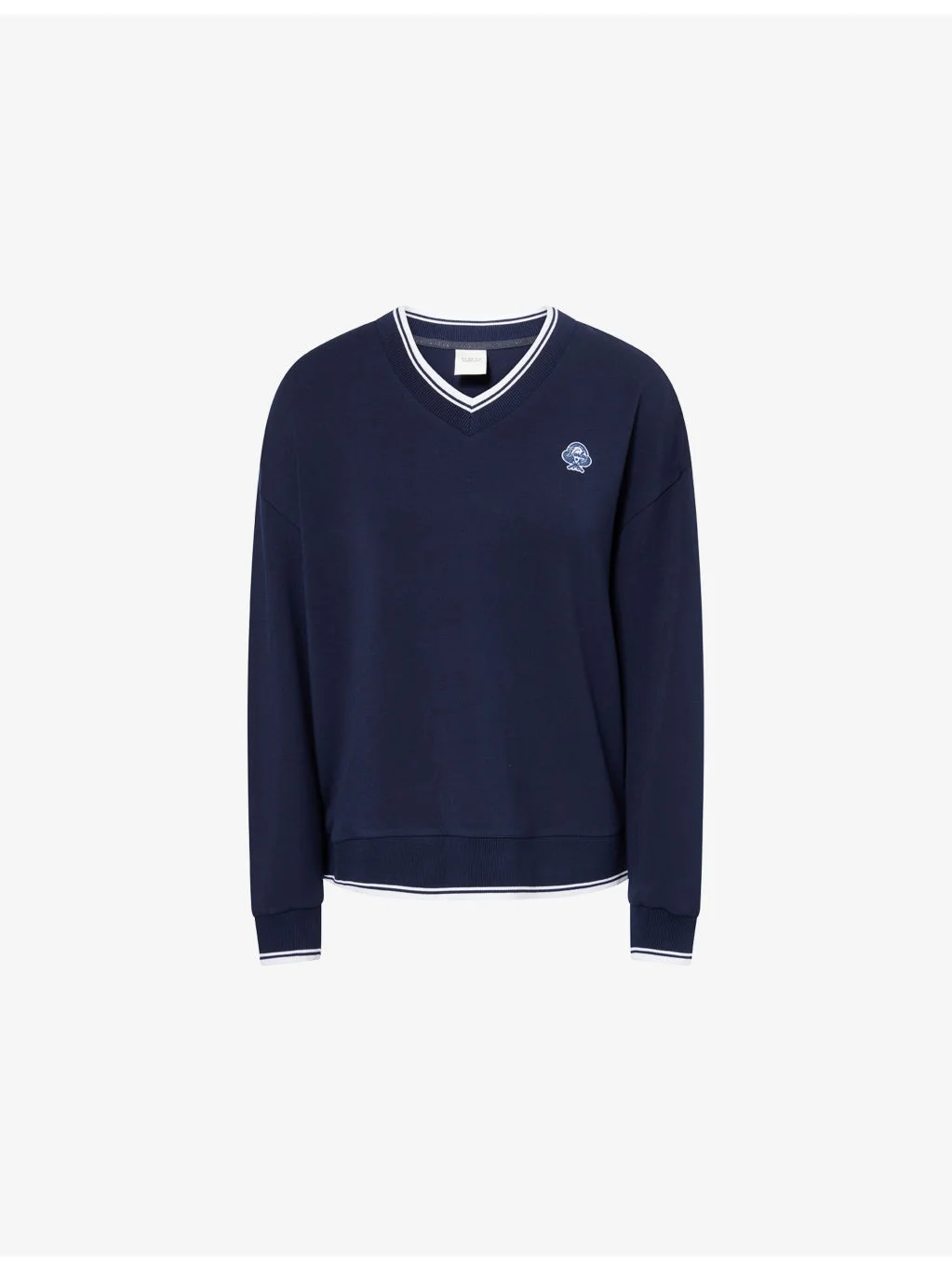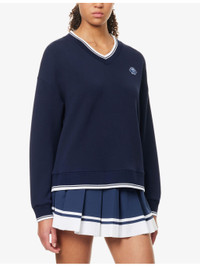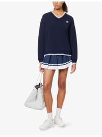 PRODUCT DETAILS - Varley knitted jumber - 81% viscose, 15% polyester, 4% elastane - V-neckline, long sleeves, embroidered logo detailing at front, striped ribbed trims - Machine wash cold - True to size - Model is 5ft 10in/1.78m and wears a size small - Lightweight, stretchy Ref: R04470179