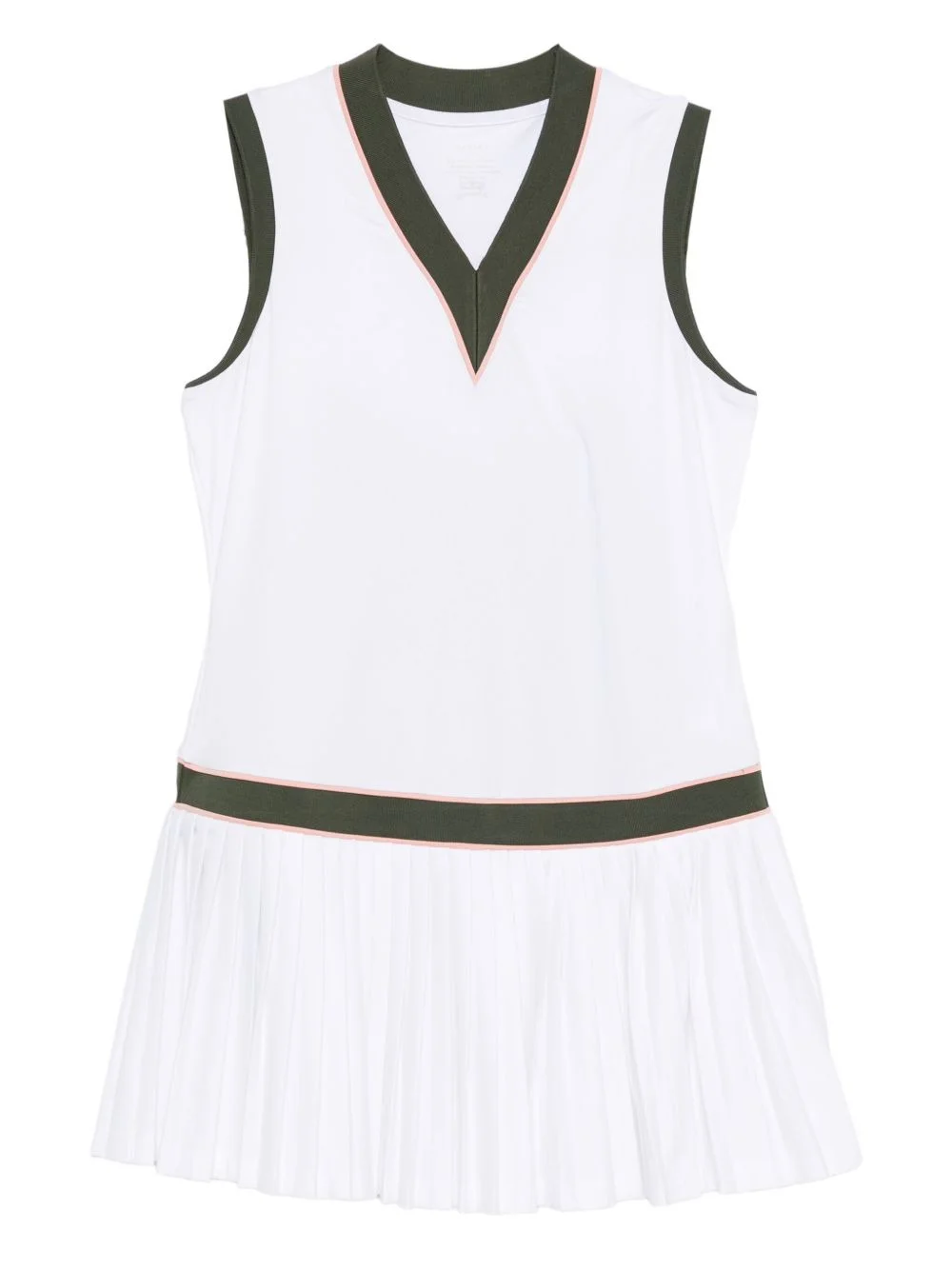 pleated V-neck mini dress Highlights - White - Pleated skirt - V-neck - Sleeveless - Contrastring trim Imported Composition Outer: Recycled Polyester 52%, Polyester 36%, Elastane 12% Lining: Polyester 84%, Elastane 16% Washing instructions Machine Wash