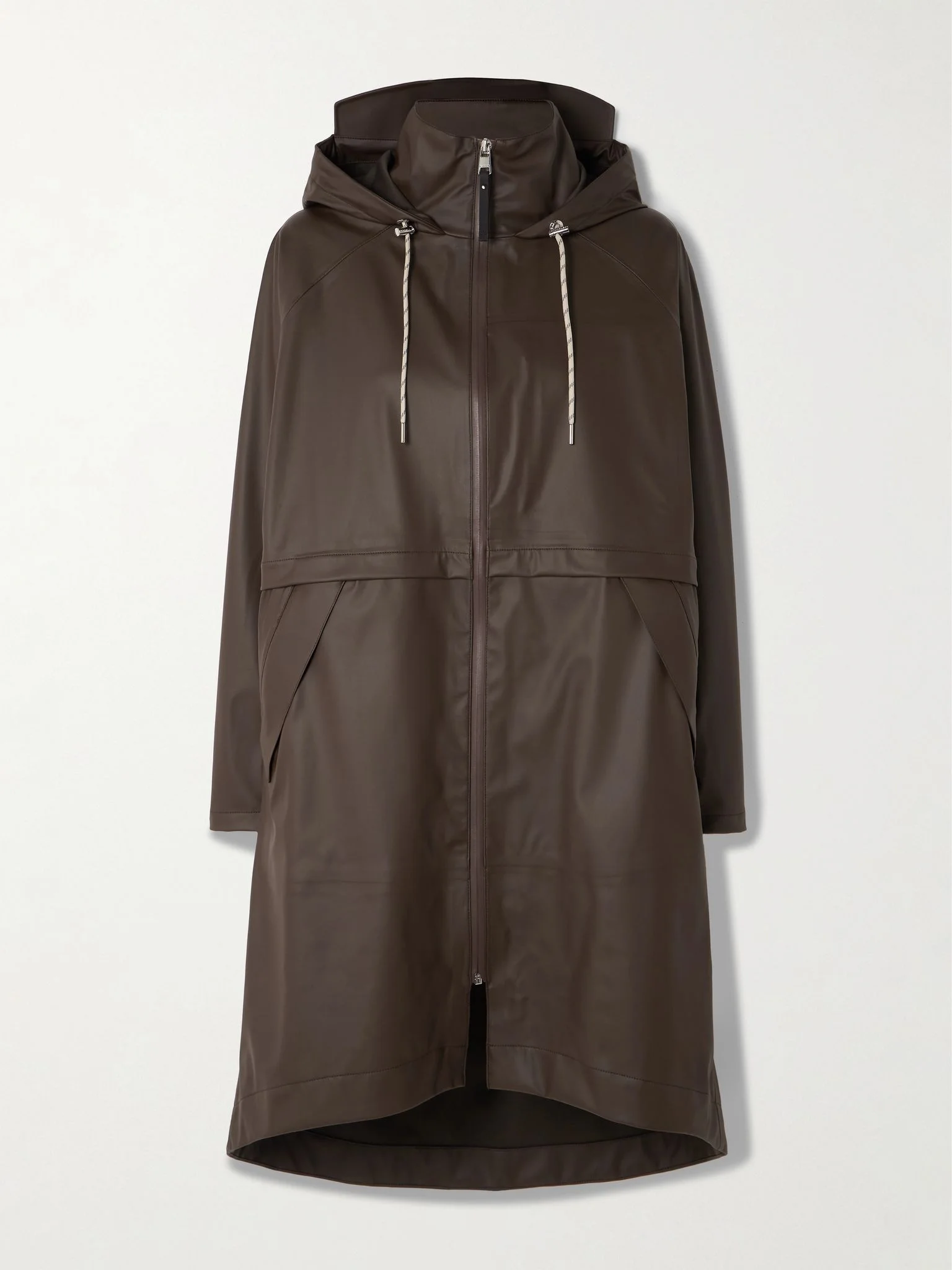 Don't let bad weather get in the way of your day - or sense of style. Varley's 'Kirsten' shell jacket is coated for a waterproof finish and has a hood for coverage. Keep it in your car or folded in your tote for emergency downpours. Size & Fit - Fits true to size, take your normal size - Designed for a slightly loose fit, use the adjustable drawstring to cinch in at the waist - Dropped shoulder seam - Lightweight, non-stretchy fabric - Model is 177cm/ 5'10" and is wearing a size Small Model measurements: - Bust: 75cm/ 30" - Waist: 61cm/ 24” - Hip: 91cm/ 36” Details & Care - Brown coated-shell - Zip fastening through front - 100% polyester; coating: 100% polyurethane - Partially lined - Designer color: Dark Truffle