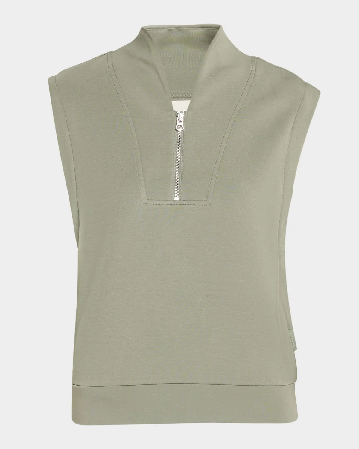 Varley "Loretta" sweatshirt Halfzip shawl collar Sleeveless Hip length Relaxed fit Banded hem Pullover style Viscose/polyester/elastane Imported