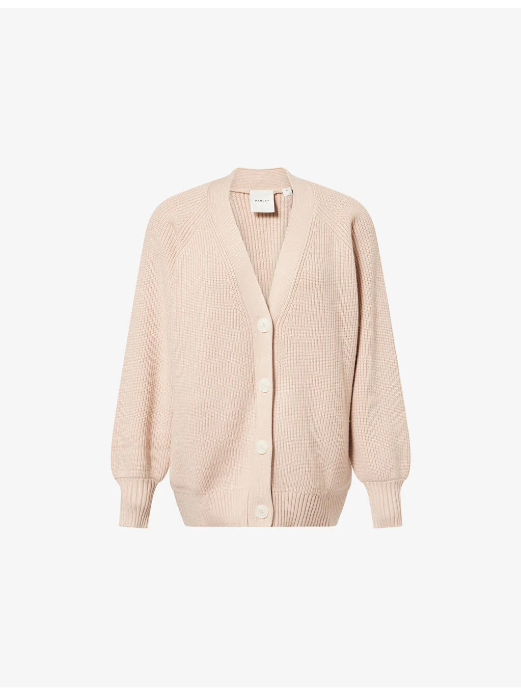 PRODUCT DETAILS - Varley knitted cardigan - 42% viscose, 30% polyester, 20% nylon, 8% elastane - Button fastening - Relaxed fit, V-neckline, long sleeves, ribbed knit texture - Machine wash cold - True to size - Model is 5ft 10in/1.78m and wears a size small - Midweight, stretchy Ref: R04544298