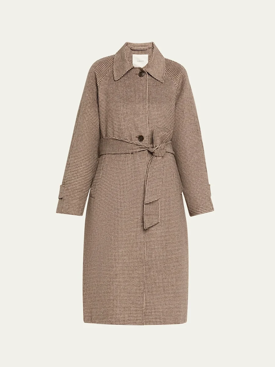 Crafted from double-faced, unlined melton fabric, the "Tomlinson" houndstooth coat by Varley is lightweight and soft, making it the perfect transitional piece Spread collar; button front Long sleeves; button cuffs Self-tie sash belt Side pockets Hem falls below the knee Polyester/wool Imported Online Inquiries: BGS21_T87A2| Store Inquiries: #5247327