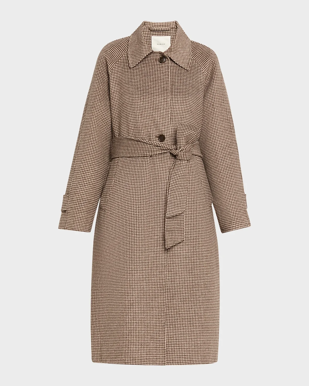 Crafted from doublefaced, unlined melton fabric, the "Tomlinson" houndstooth coat by Varley is lightweight and soft, making it the perfect transitional piece Spread collar; button front Long sleeves; button cuffs Selftie sash belt Side pockets Hem falls below the knee Polyester/wool Imported