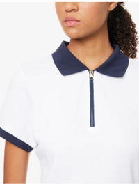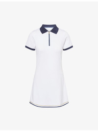 PRODUCT DETAILS - Varley cotton-blend mini dress - 58% cotton, 27% polyester, 15% modal - Exposed zip fastening at front - Shirt collar, short sleeves, contrast trims, all-over knitted texture - Machine wash cold - True to size - Size small: length 33in / 83.8cm - Model is 5ft 10in/1.78m and wears a size small - Lightweight, stretchy Ref: R04470180