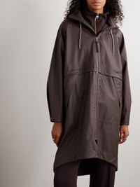 Don't let bad weather get in the way of your day - or sense of style. Varley's 'Kirsten' shell jacket is coated for a waterproof finish and has a hood for coverage. Keep it in your car or folded in your tote for emergency downpours. Size & Fit - Fits true to size, take your normal size - Designed for a slightly loose fit, use the adjustable drawstring to cinch in at the waist - Dropped shoulder seam - Lightweight, non-stretchy fabric - Model is 177cm/ 5'10" and is wearing a size Small Model measurements: - Bust: 75cm/ 30" - Waist: 61cm/ 24” - Hip: 91cm/ 36” Details & Care - Brown coated-shell - Zip fastening through front - 100% polyester; coating: 100% polyurethane - Partially lined - Designer color: Dark Truffle