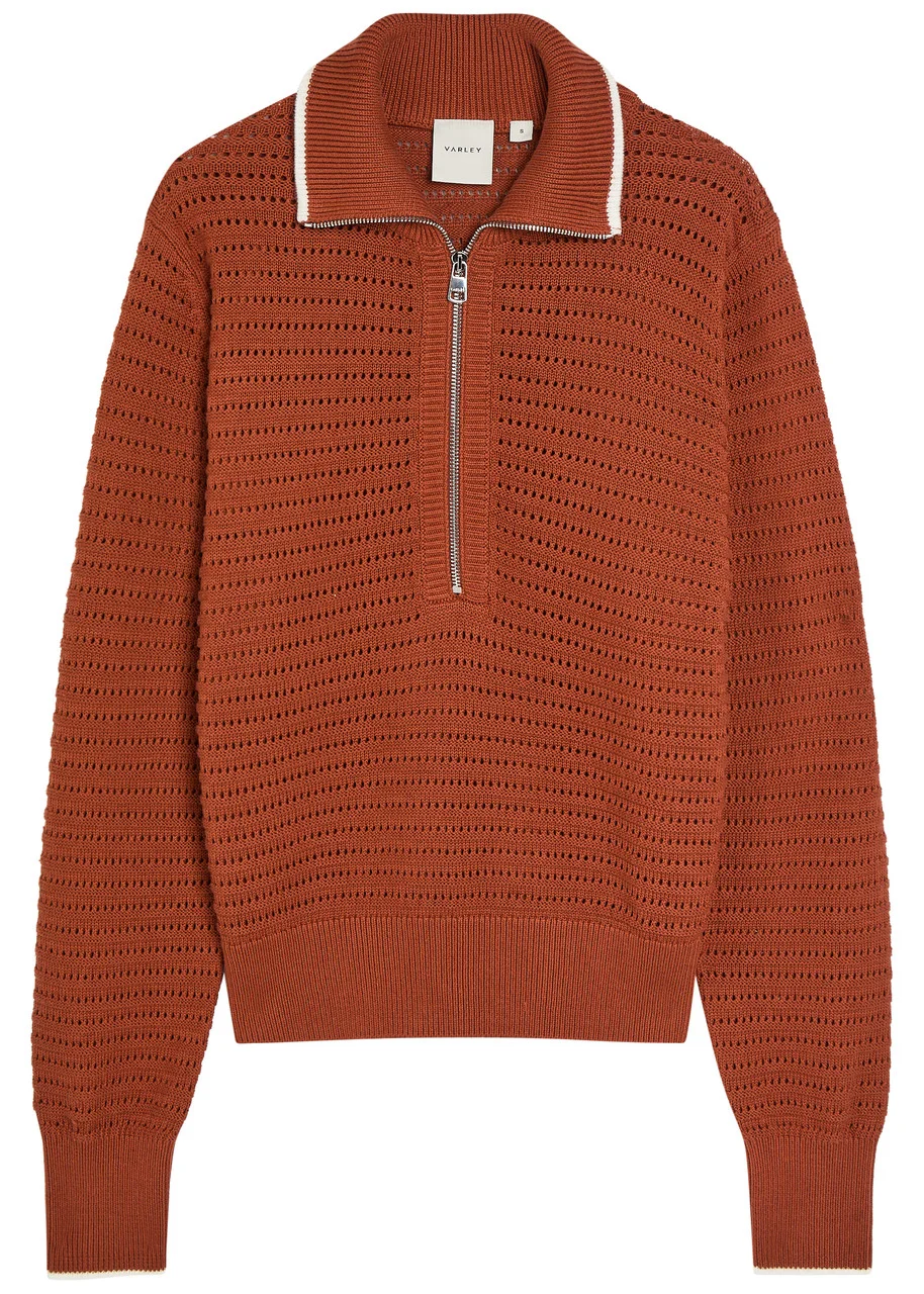 Info & Care Varley cotton-knit jumper Open knit, zip-fastening high-neck, contrasting ribbed trims Slips on 100% cotton Machine wash Size & Fit Length shoulder to hem: 24 inches/ 61cm Midweight Relaxed fit Model is 5'10"/ 178cm and wears a size small