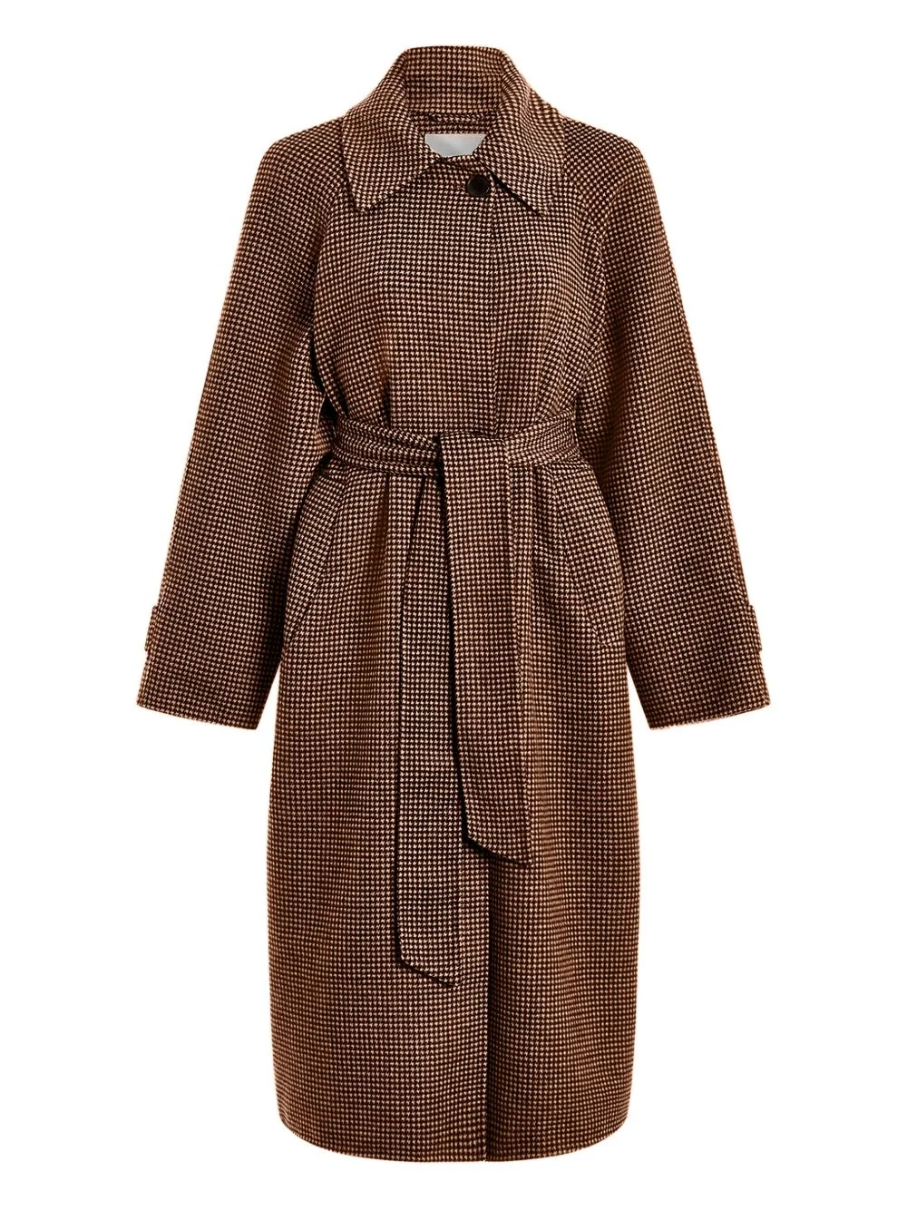 belted puppytooth coat Highlights - Taupe brown - Micro puppytooth pattern - Belted waist - Long sleeves - Classic collar - Side inset pockets Imported Composition Polyester 80%, Wool 20% Washing instructions Read Manufacturer Guidelines