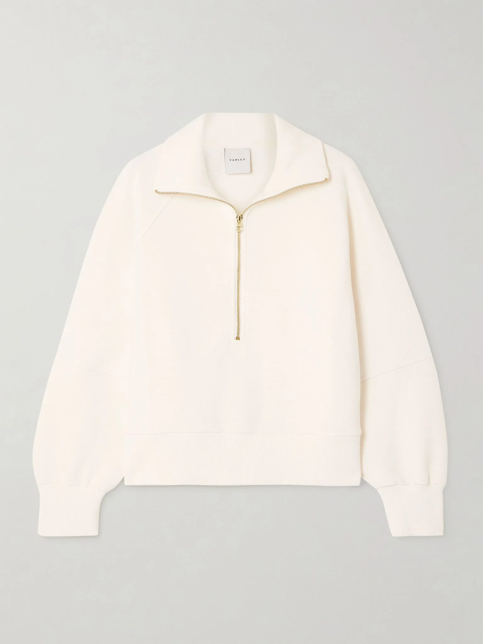 Varley's 'Milano' sweatshirt is made from ribbed cotton-blend jersey for a relaxed, boxy shape and has a stand collar that unzips to lay flat across your shoulders. Wear yours with leggings when running errands. Size & Fit - Fits true to size, take your normal size - Designed for a boxy fit, cut to be worn loose - Mid-weight, stretchy fabric - Model is wearing a size Small Details & Care - Ivory cotton-blend jersey - Zip fastening along front - 55% cotton, 44% polyester, 1% elastane - Machine wash