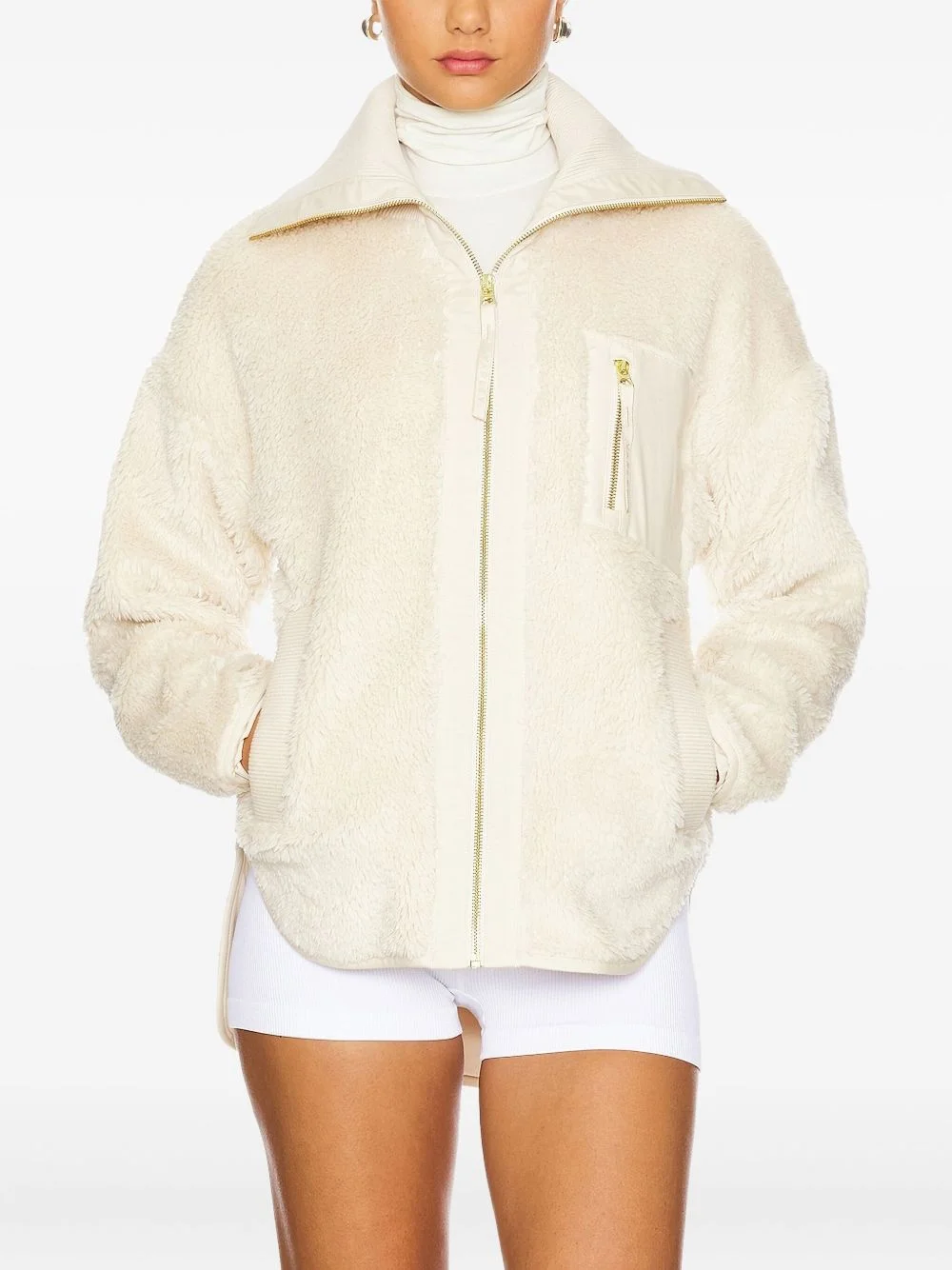 zip-up fleece jacket Highlights - White - Fleece texture - Zip fastening - High neck - Welt pockets - Ribbed cuffs Made in United Kingdom Composition Polyester 100% Washing instructions Read Manufacturer Guidelines