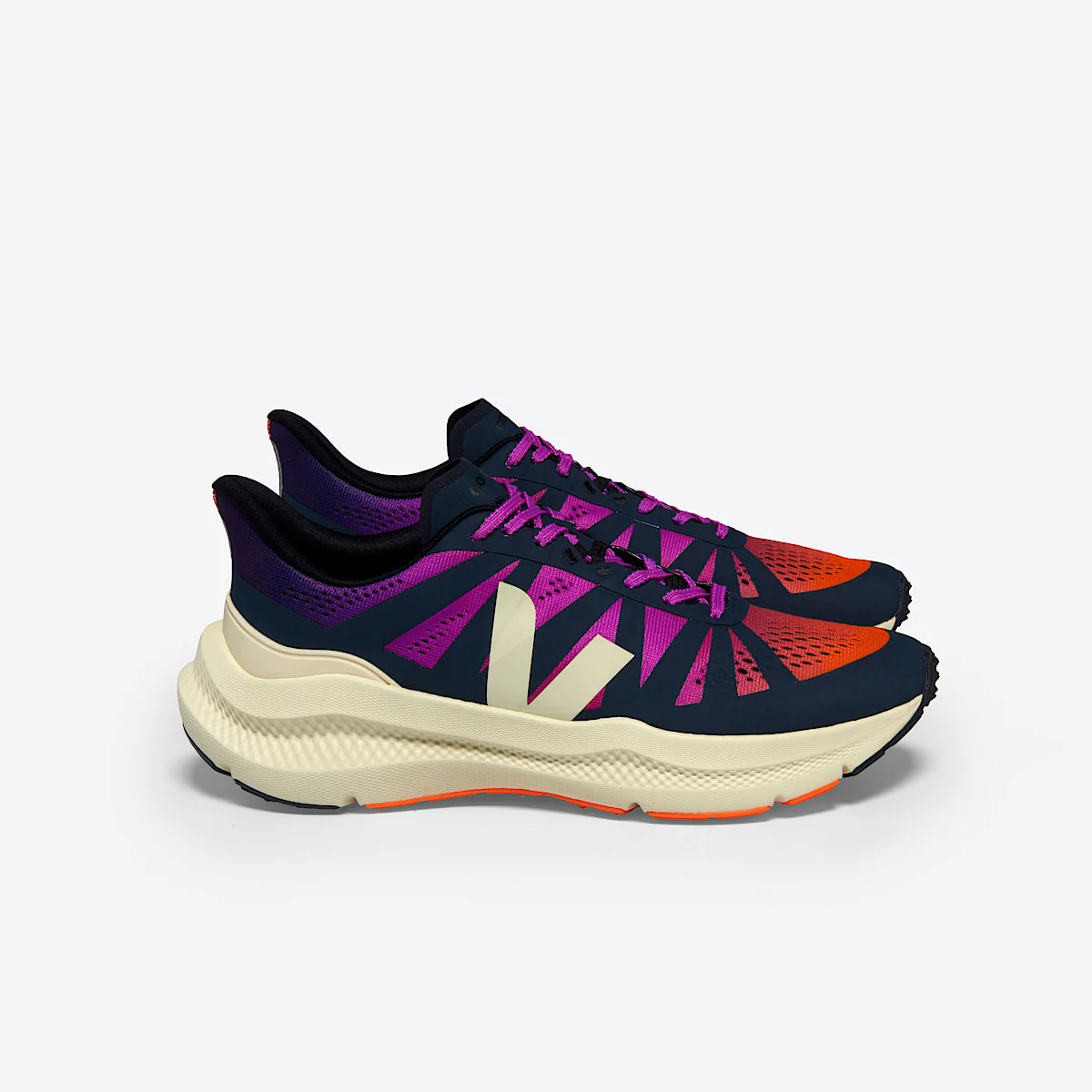 Discover the Condor 3, the new VEJA running shoes - Lab-tested & Runners approved. Weight: 287 g / 10,1 oz Drop: 8 mm Stride: Neutral Surface: Road Weight: 287 g / 10,1 oz Drop: 8 mm Stride: Neutral Surface: Road Upper: Ketten Engineered-Mesh (100% recycled polyester) and Screen printing Panels: T.P.U. Logo V: T.P.U. Heel support insert: T.P.U. Insole: Bio-based E.V.A. (65%, including 42% sugarcane), recycled polyester (23%) and others (12%) Midsole: Expanded Rubber Technology - E.V.A. bio-sourced (43%, including 31% sugar cane), amazonian rubber (27%) and others (30%) Outsole: Amazonian rubber (25%), mineral silica (22%), synthetic rubber (25%) and others (28%) Lining: Recycled polyester (100%) Laces: Recycled polyester (100%) Made in Brazil This knitting technique “Engineered-Mesh” offers a tailor-made placement of breathable and supportive areas. The mesh alternates between tight stitches and spaced-out stitches.