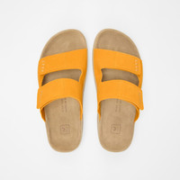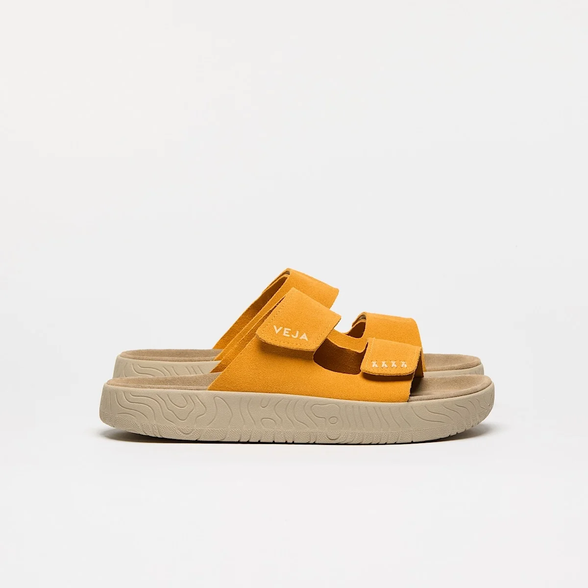VEJA presents Etna, it’s first sandal. This new model pays tributes to the brand’s Brazilian roots. Between city, nature and adventure, Etna invites us to explore and travel. Upper: Suede Lining: Suede Insole: Bio-based E.V.A. (57%, including 41% sugar cane), recycled E.V.A. (11%) and others (32%) Outsole: Amazonian rubber (40%), mineral silica (23%), recycled rubber (10%), synthetic rubber (11%) and others (16%) Made in Brazil Suede is the underside of leather, sanded to give it a soft and smooth feel. It comes from farms in the Rio Grande do Sul region and is tanned in Brazil without harmful or prohibited chemicals. VEJA uses dyes that meet regulations and prioritizes responsible water use during the tanning process. This suede is then coated with PFC-free water-repellent oils to shield the sneakers from light rain.