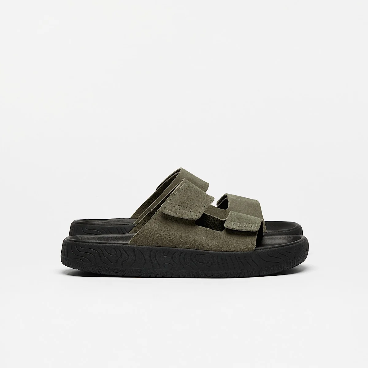 VEJA presents Etna, it’s first sandal. This new model pays tributes to the brand’s Brazilian roots. Between city, nature and adventure, Etna invites us to explore and travel. Upper: Suede Lining: Leather Insole: Bio-based E.V.A. (57%, including 41% sugar cane), recycled E.V.A. (11%) and others (32%) Outsole: Amazonian rubber (40%), mineral silica (23%), recycled rubber (10%), synthetic rubber (11%) and others (16%) Made in Brazil Suede is the underside of leather, sanded to give it a soft and smooth feel. It comes from farms in the Rio Grande do Sul region and is tanned in Brazil without harmful or prohibited chemicals. VEJA uses dyes that meet regulations and prioritizes responsible water use during the tanning process. This suede is then coated with PFC-free water-repellent oils to shield the sneakers from light rain.