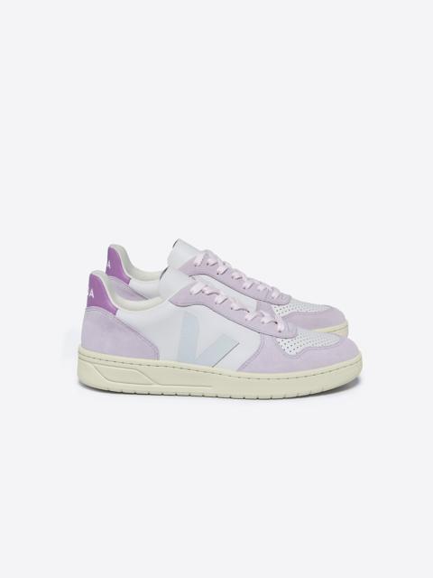The V-10 stands for 10 years of love, designed for VEJA's 10th anniversary. Upper: Leather Panels: Leather Logo V: Amazonian rubber (26%), mineral silica (22%), synthetic rubber (21%) and others (31%) Insole: Amazonian rubber (11%), bio-based E.V.A.* (53%, including 42% sugarcane), recycled E.V.A.* (11%), organic cotton (12%) and others (13%) Outsole: Amazonian rubber (40%), mineral silica (23%), recycled rubber (10%), synthetic rubber (11%) and others (16%) Lining: Recycled polyester (100%) Laces: Organic cotton (100%) Made in Brazil The bovine leather comes from farms in Uruguay, a country known for its culture of animal husbandry and the quality of its leather. It is tanned in Brazil, respecting the REACH norms. Special attention is paid to water usage during the tanning process.