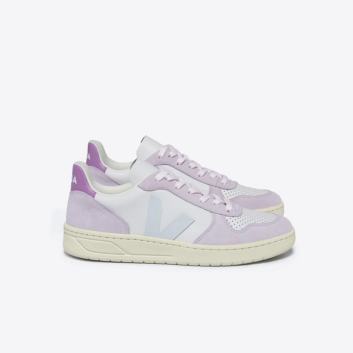 The V-10 stands for 10 years of love, designed for VEJA's 10th anniversary. Upper: Leather Panels: Leather and Suede Logo V: Amazonian rubber (26%), silica mineral (31%), synthetic rubber (21%) and others (22%) Insole: Amazonian rubber (11%), bio-based E.V.A.* (53%, including 42% sugarcane), recycled E.V.A.* (11%), organic cotton (12%) and others (13%) Outsole: Amazonian rubber (40%), mineral silica (23%), recycled rubber (10%), synthetic rubber (11%) and others (16%) Lining: Recycled polyester (100%) Laces: Organic cotton (100%) Made in Brazil The bovine leather comes from farms in Uruguay, a country known for its culture of animal husbandry and the quality of its leather. It is tanned in Brazil, respecting the REACH norms. Special attention is paid to water usage during the tanning process.
