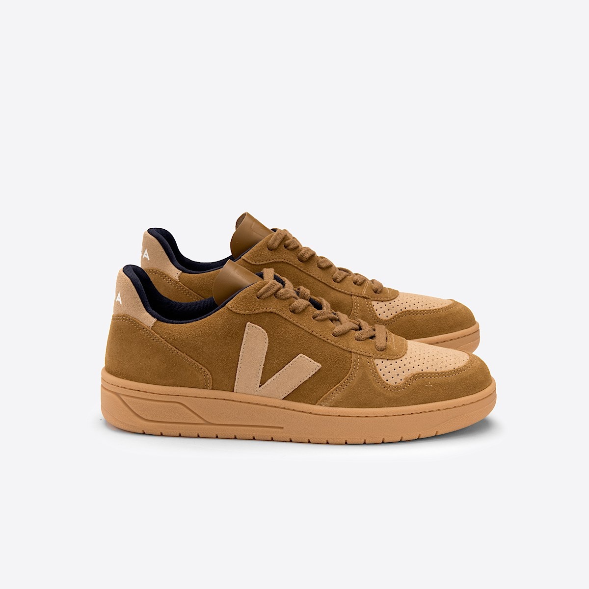 The V-10 stands for 10 years of love, designed for VEJA's 10th anniversary. Upper: Suede Panels: Leather and Suede Logo V: Amazonian rubber (26%), mineral silica (22%), synthetic rubber (21%) and others (31%) Insole: Amazonian rubber (11%), bio-based E.V.A.* (53%, including 42% sugarcane), recycled E.V.A.* (11%), organic cotton (12%) and others (13%) Outsole: Amazonian rubber (40%), mineral silica (23%), recycled rubber (10%), synthetic rubber (11%) and others (16%) Lining: Recycled polyester (100%) Laces: Organic cotton (100%) Made in Brazil Suede is the underside of leather, sanded to give it a soft and smooth feel. It comes from farms in the Rio Grande do Sul region and is tanned in Brazil without harmful or prohibited chemicals. VEJA uses dyes that meet regulations and prioritizes responsible water use during the tanning process. This suede is then coated with PFC-free water-repellent oils to shield the sneakers from light rain.