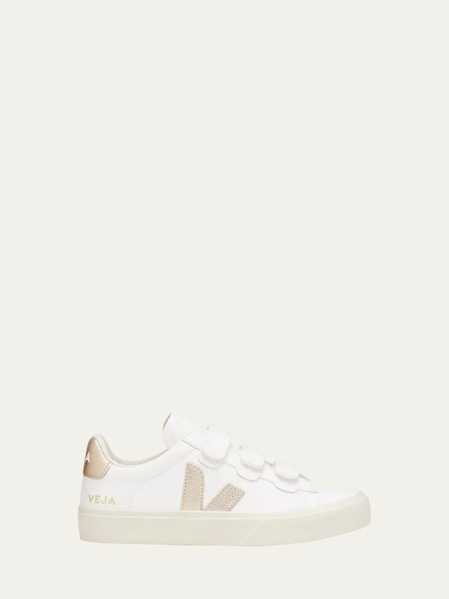 VEJA "Recife" smooth and metallic leather low-top sneakers with logo and collar. 1" flat heel. Round toe. Triple grip strap vamp. Cushioned footbed. Recycled polyester lining. Rubber sole. Made in Brazil. Online Inquiries: BGS21_X7F7P| Store Inquiries: #4073062