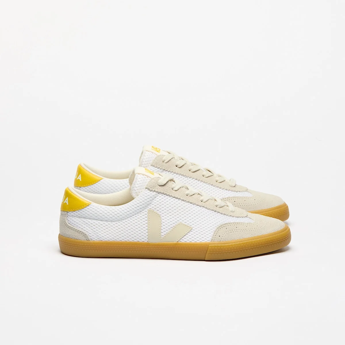 Inspired by the Brazilian volleyball shoes of the 70s, VEJA is reissuing the Volley - its very first model launched in 2005. Upper: Aircell (75% recycled polyester and 25% polyester) Panels: Suede and Organic Traced leather (O.T.) Logo V: Amazonian rubber (26%), mineral silica (22%), synthetic rubber (21%) and others (31%) Insole: Amazonian rubber (11%), bio-based E.V.A.* (53%, including 42% sugarcane), recycled E.V.A.* (11%), organic cotton (12%) and others (13%) Outsole: Amazonian rubber (40%), mineral silica (23%), recycled rubber (10%), synthetic rubber (11%) and others (16%) Welt: Synthetic rubber (40%), mineral silica (22%) and others (38%) Lining: Recycled polyester (100%) Laces: Organic cotton (100%) Made in Brazil Aircell is an extremely lightweight and breathable fabric made entirely from recycled polyester. The double-layer knitting technique used for this fabric allows us not to use a lining. This is due to its strong structure despite being so permeable to air. It offers perfect comfort and flexibility allowing it to be used in the extra-light styles of our collection.