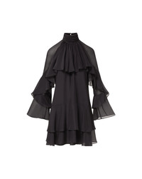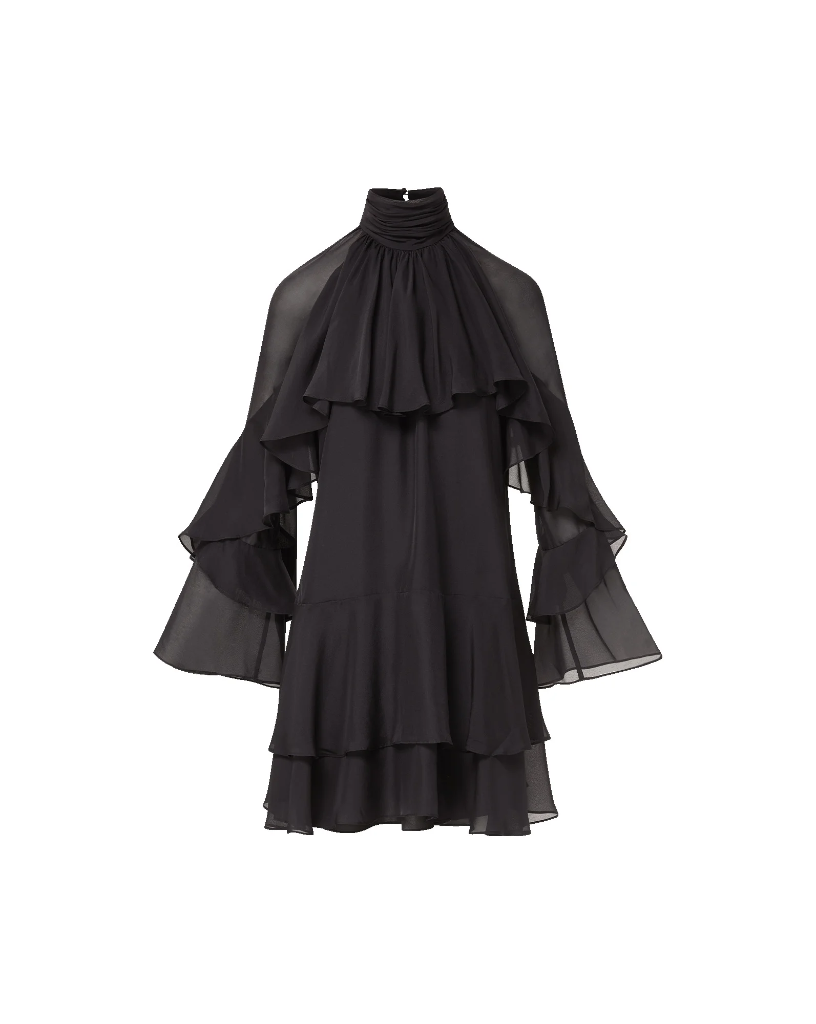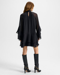 Product details A dramatic silhouette designed to turn heads. Crafted from premium silk, the Adlington mini dress features a halter neckline that flows into an A-line silhouette with cascading tiered ruffles. Sheer long sleeves accentuate the halter shape, adding to the romance of the design. Perfect for date night or event dressing—pair with tall boots or strappy heels to complete the look. - 100% Silk - Lining: 100% Polyester - Dry clean only - Style #2509CH3821812