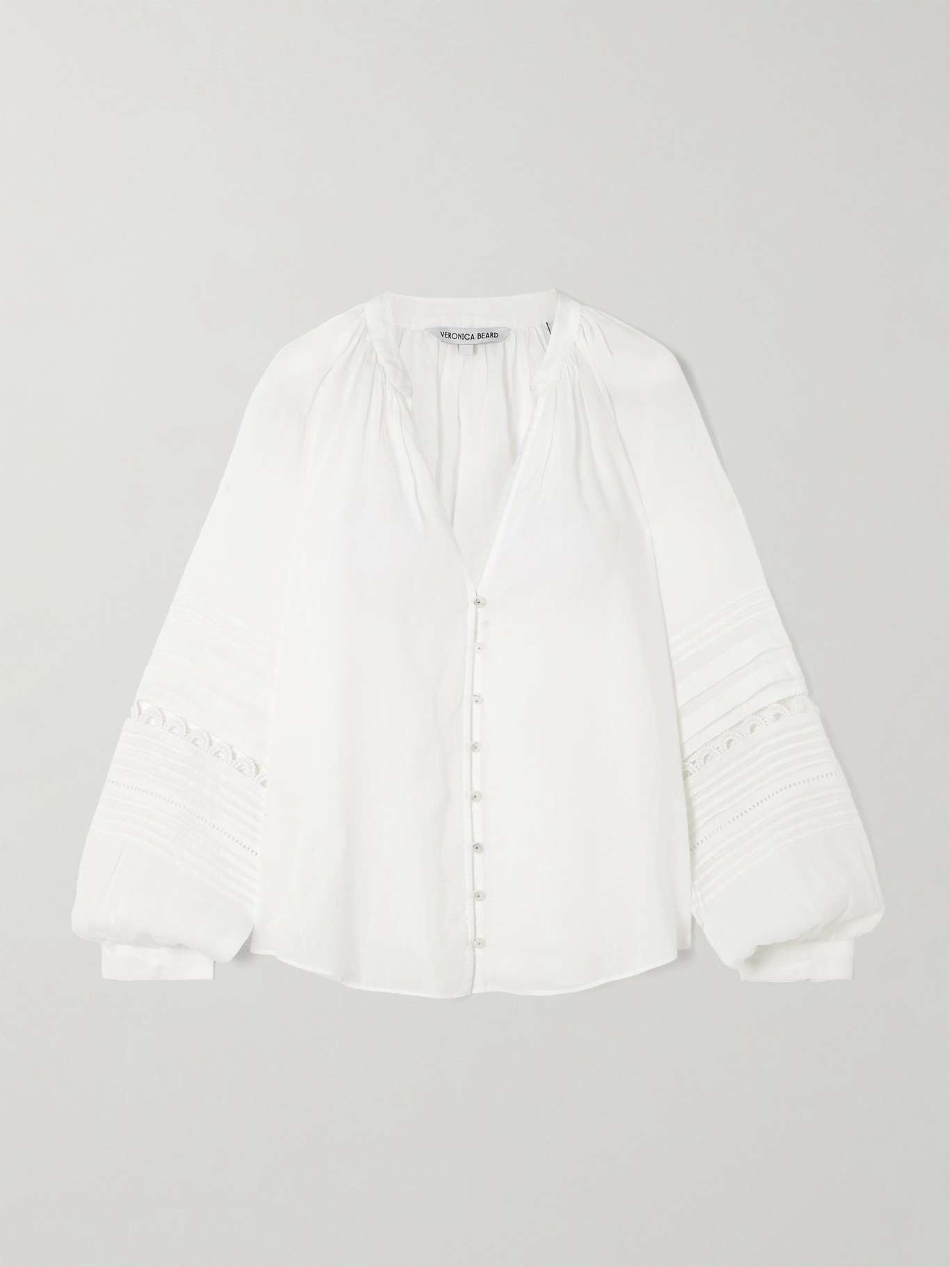 EDITORS'NOTES Veronica Beard believes that the ideal wardrobe "has to work for a multifaceted, layered life", which is why its collections consist of effortless classics. This 'Ailani' blouse is cut from airy ramie-voile and has blouson sleeves detailed with pintucks and crochet trims. SIZE & FIT Model measurements: - Fits true to size, take your normal size - Designed for a slightly loose fit - Lightweight, non-stretchy fabric - Model is 180cm/ 5'11" and is wearing a US 6 - Bust: 89cm/ 35" - Waist: 69cm/ 27" - Hip: 97cm/ 38" DETAILS & CARE - White ramie-voile - Button fastenings through front - 100% ramie - Dry clean - Mother-of-pearl: Australia