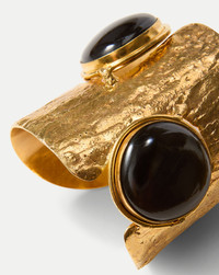 Product details A cuff that makes a statement. Designed in Paris and handcrafted in India, the Ajouree cuff is made from 22k gold-plated brass with a hammered finish. Adjustable for ease, it’s defined by two bezel-set smoky quartz cabochons sourced from Jaipur. It’s part of our jewelry capsule with Parisian artist and designer Sylvia Toledano—colorful, meticulously crafted talismans that embody a luxe bohemian spirit and complement our Fall 2025 collection. - 22k Gold-Plated Brass, Smoky Quartz - Stone country of origin: India - Width: 2.5” - Gently wipe surface with a soft cloth to clean. Avoid direct contact with lotions, perfumes, or oils. - Style #C59-G