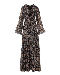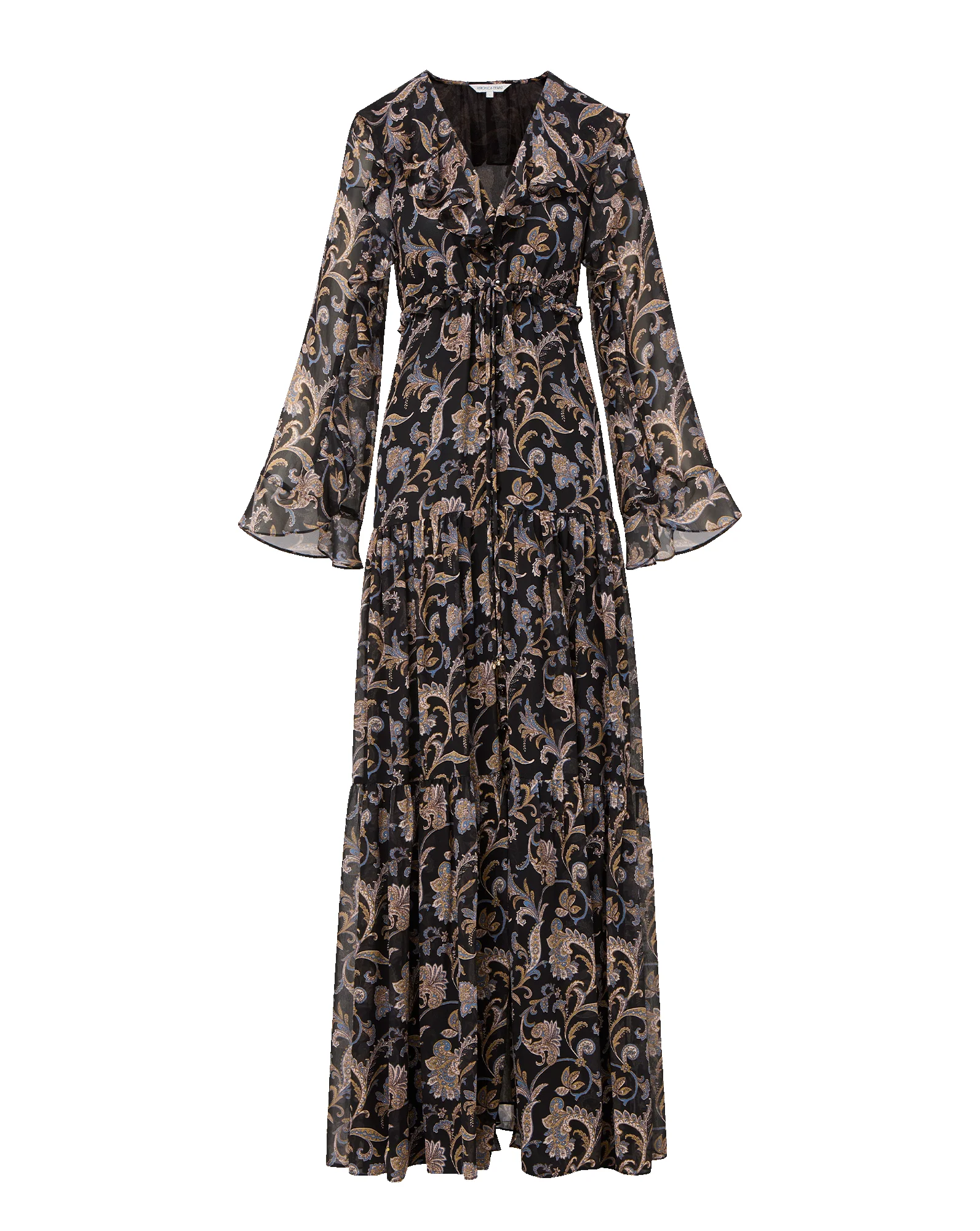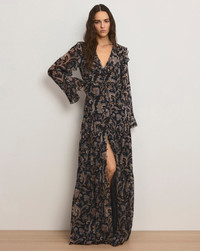 Product details Spun from luxurious silk georgette, the Akara dress is your new go-to for romantic, bohemian dressing. Featuring a warm paisley floral print set in inky black, this maxi is designed with a softly ruffled deep V-neckline and long bell sleeves. Tiered panels and an elasticized, ruffled waistband—with an adjustable tie for a cinched effect—create beautiful movement. Perfect for events or date nights alike—just add a tall boot or strappy heel. - 100% Silk - Lining: 100% Polyester - Dry clean only - Style #2602GGT0622384