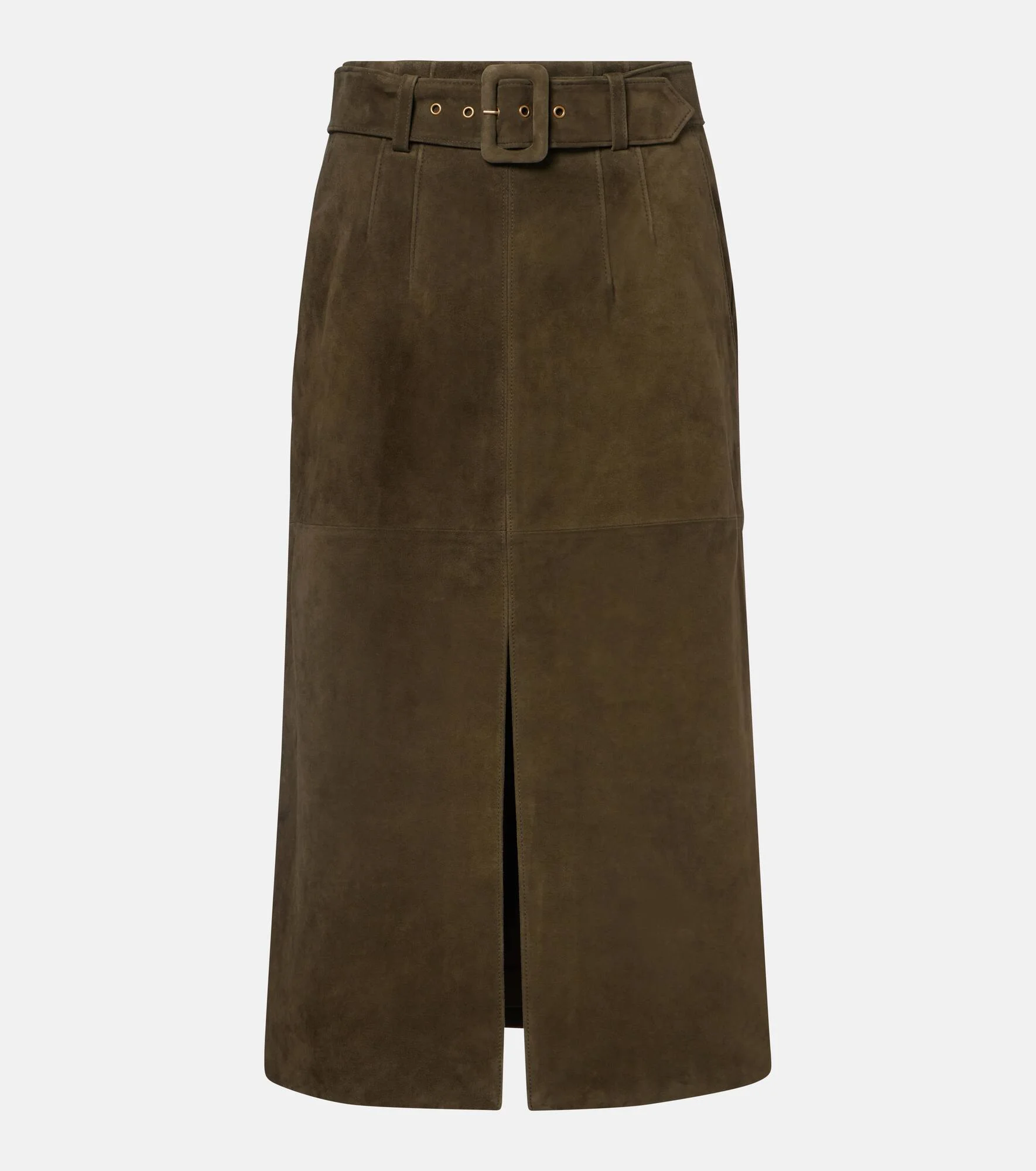 Veronica Beard's low-effort, high-impact separates find the perfect balance between casual and chic. The Alexie midi skirt is crafted from supple suede and is finished with a matching belt. Product Details - Material: 100% lamb leather (suede) - Care instructions: specialist clean - Made in China - Designer color name: Cypress - Item color: green - Lining: 100% polyester - Closure: concealed zipped back - Detachable belt - Pockets: slant pockets - Short vent - Item number: P01096291 Size & Fit - True to size - Adjustable at the waist - Non-stretchy fabric - slit length 36cm-14" - The model seen in the picture is 178cm-5'10" and wearing a size US 4