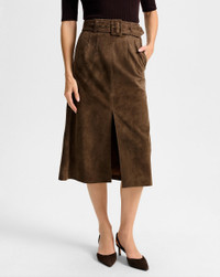 Product details The suede skirt, perfected. Crafted from 100% soft lambskin, the Alexie A-line midi skirt features a high Hollywood waistband to define shape, finished with a matching belt with a suede-covered buckle to further accentuate the waist. It’s finished with side slant pockets and a center-front slit for ease. Style with a simple tee or knit to elevate the everyday. - 100% Lambskin - Lining: 100% Polyester - Professional leather cleaning only - Style #2509LT6530645