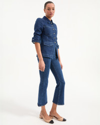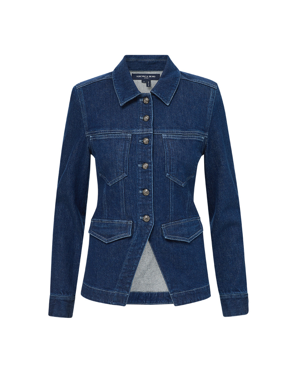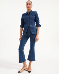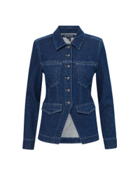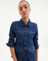 Product details The jean jacket, elevated. Made from Italian stretch denim, the Alfie is tailored like a fitted blazer—complete with a cinched waist and an angled cutaway hem. A trim collar, contrast-color topstitching and two sets of front pockets complete the look. Pair with wide-leg jeans for a chic take on double denim. - 98% Cotton, 2% Elastane - Unlined - Fabric country of origin: Italy - Turn inside out and machine wash cold. Hang to dry. - Style #J25027210099ID
