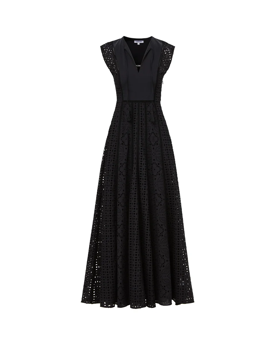 Product details Expertly tailored from lightweight cotton, the black Alina sleeveless dress is defined by an elegant, sweeping maxi silhouette and a charming allover eyelet design. A split-v neck with tassels complete the look. Sophisticated yet effortless—this is how you do best-dressed guest for balmy summer days. Style with chic flats or strappy slingbacks. - 100% Cotton - Lining: 100% Cotton - Dry clean only - Style #2504EM7821654