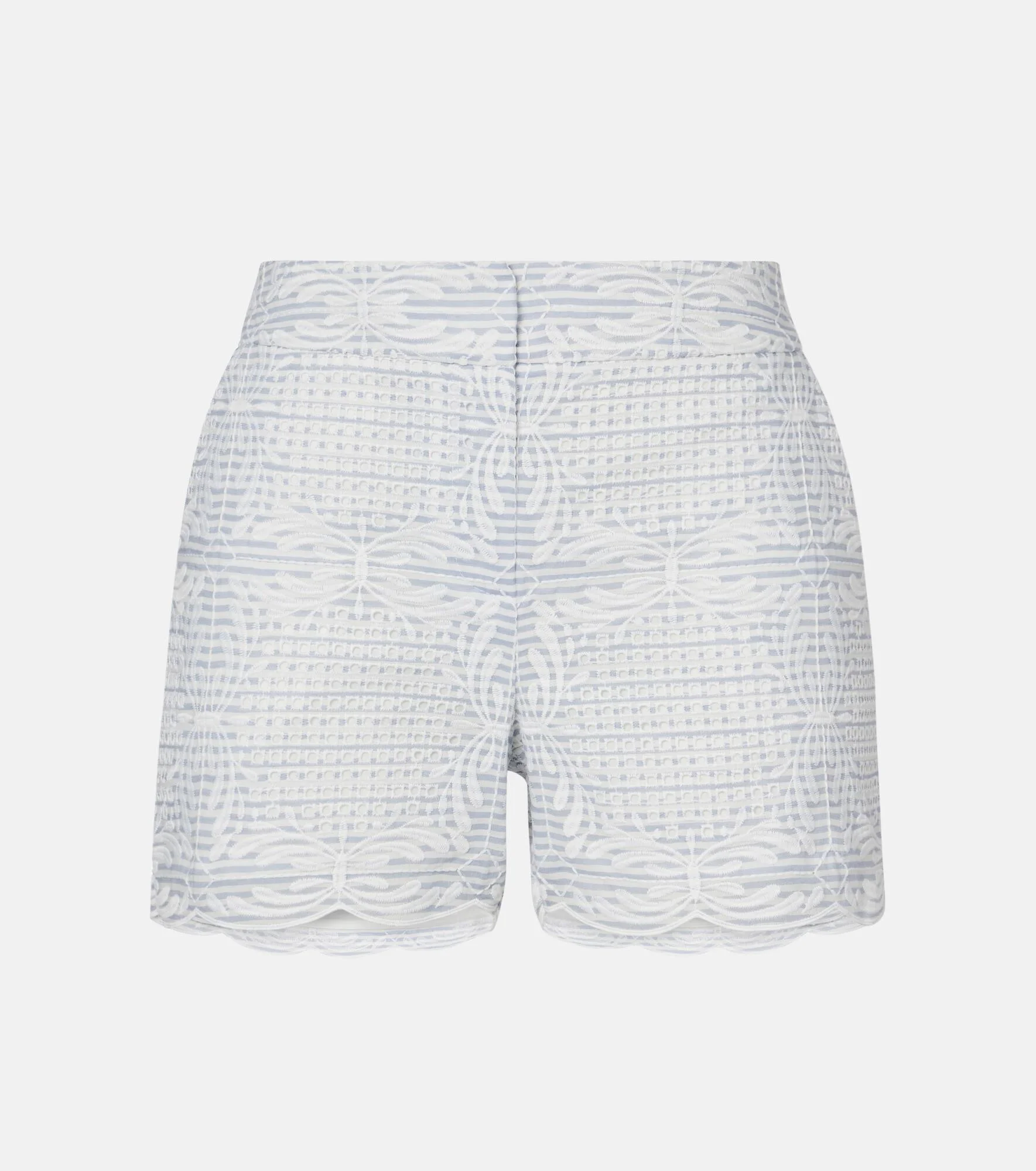 The Allen shorts from Veronica Beard feature a flattering high-rise silhouette with a delicate, all-over eyelet and petal pattern. The elegant design is complete with a scalloped hem and slant pockets. Product Details - Material: 64% polyester, 36% cotton - Care instructions: dry clean - Made in China - Designer color name: Blue/White - Item color: blue, white - Lining: 100% cotton - Closure: zip, hook, and button fastening - Pockets: slant pockets - Item number: P01083795 Size & Fit - True to size - Non-stretchy fabric - Straight leg - The model seen in the picture is 178cm-5'10" and wearing a size US 4
