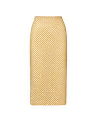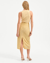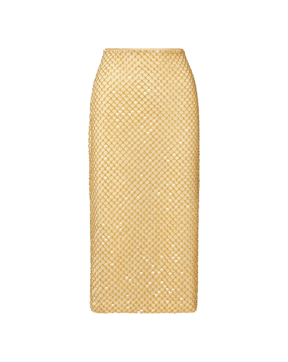 Product details In bright yellow, the Allora skirt blends effortless sophistication with high-impact shine. The clean, streamlined silhouette lets the details take center stage: It's hand-beaded in India with a mix of glass bugle beads and paillettes in an intricate netted pattern, evoking coastal textures. Pair with a simple tee and sneakers to elevate the everyday or style with an embellished top and heels for date night. - 100% Polyester - Lining: 100% Polyester - Dry clean only - Style #2505EM8730462