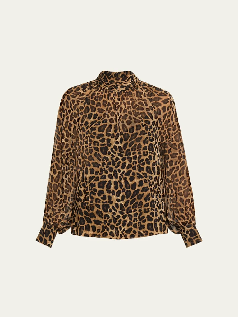 Patterned with bold leopard spots, the "Alyssa" blouse by Veronica Beard is crafted from subtly sheer silk chiffon with soft gathering throughout Approx. 23.4"L from shoulder to hem Ruched high neckline Long blouson sleeves with button cuffs; approx. 31.5"L Relaxed fit Hip length Back button closure Silk Lining: Polyester Dry clean Imported Online Inquiries: BGS21_T8R8T| Store Inquiries: #5363851