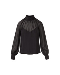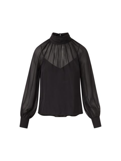 Product details Feminine ease. Crafted from subtly sheer silk chiffon, the Alyssa turtleneck blouse features a relaxed fit and soft gathering throughout for fluid, beautiful drape. The high, ruched neck fastens at the back with a delicate buttoned keyhole, while soft blouson sleeves add a romantic touch. An optional cami slip offers versatility—wear it layered or let the sheerness shine. Pair with tailored trousers for the office or a sleek mini skirt for date night. - 100% Silk - Lining: 100% Polyester - Dry clean only - Style #2509CH3841317